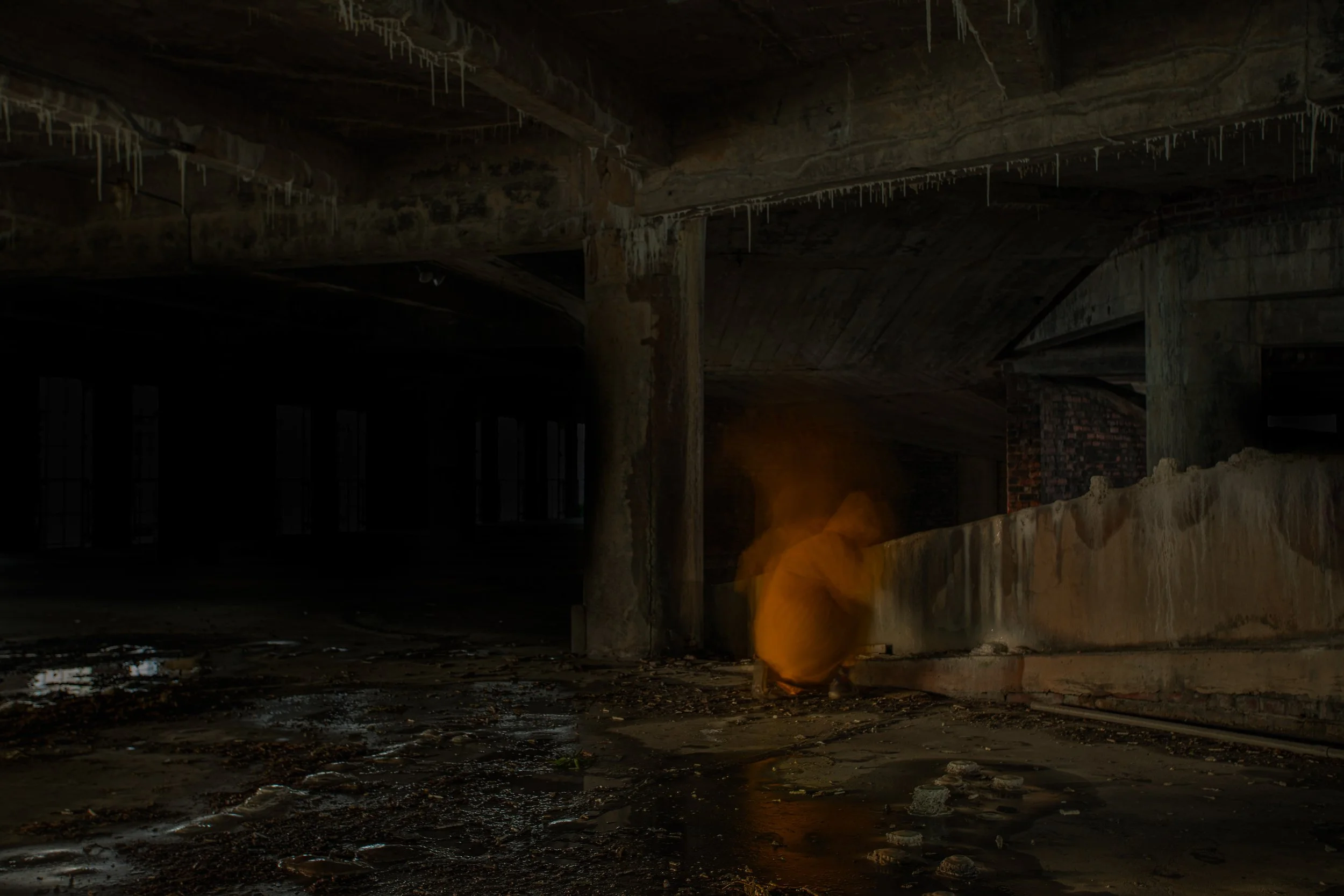 I began using external sources of light to alter the natural atmosphere of my images. In one location, I crawled inside an overgrown concrete pipe with a flashlight while my camera was on a timer. Red light spills out from the opening, altering the mood with an understanding that this is not natural.
